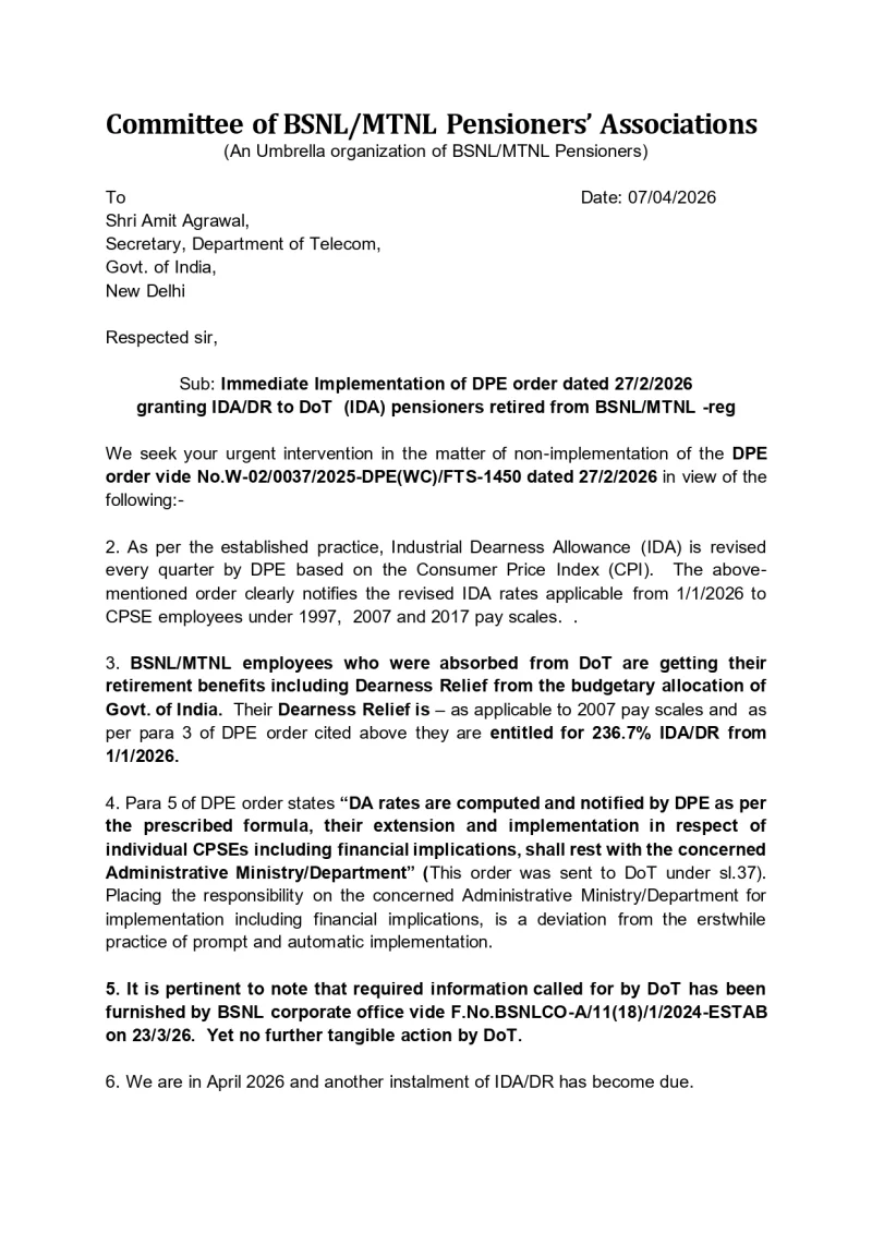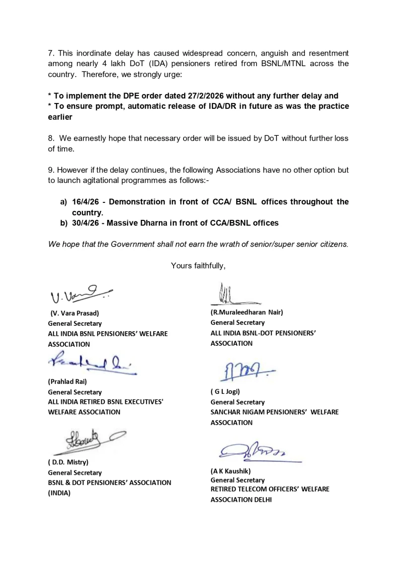 Immediately a letter, jointly signed by all GS of the above pensioners associations, will be sent to, demanding immediate release of Dearness Relief to BSNL/MTNL pensioners due from 1/1/2026 and periodic release of Dearness Relief every three months without causing any delay