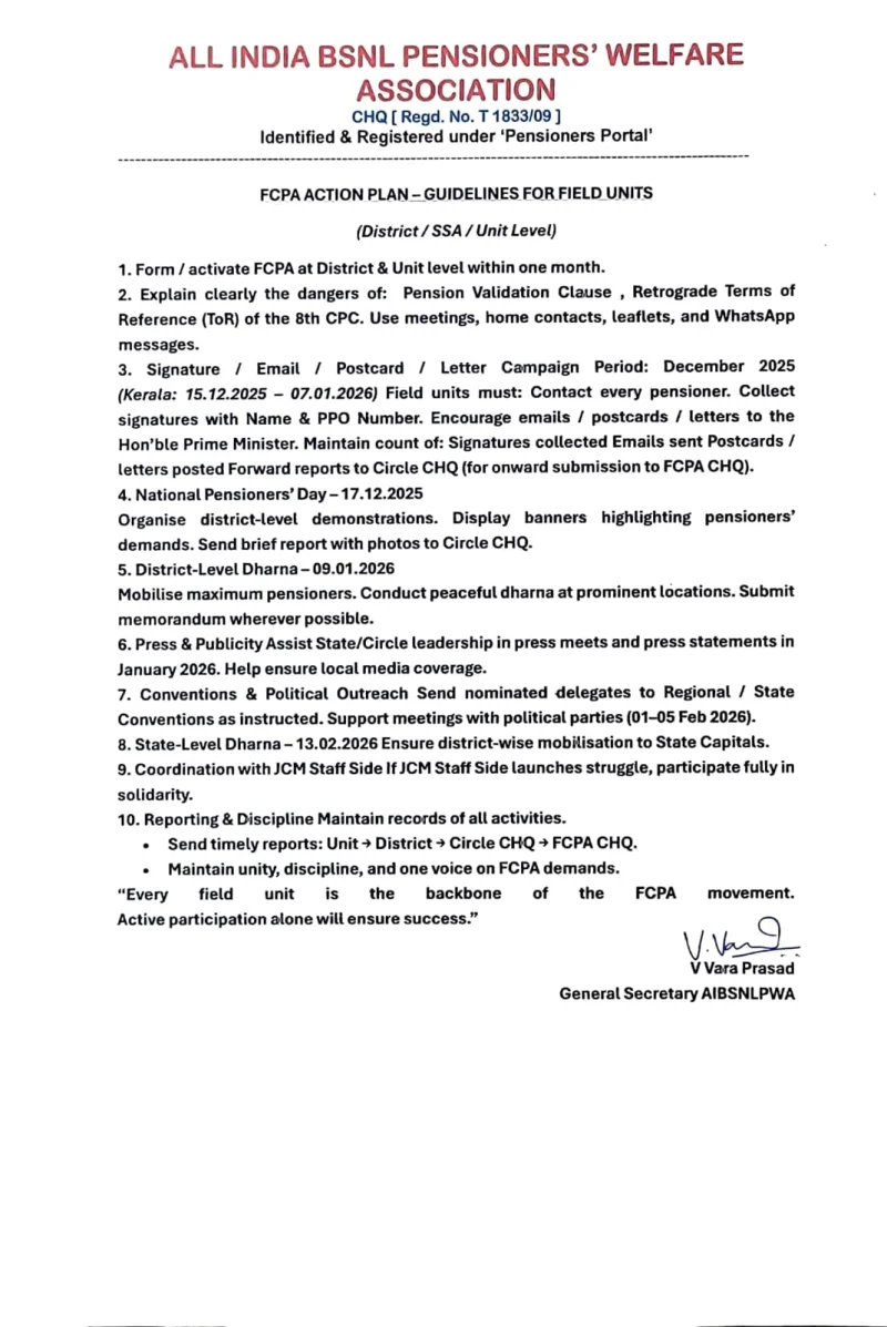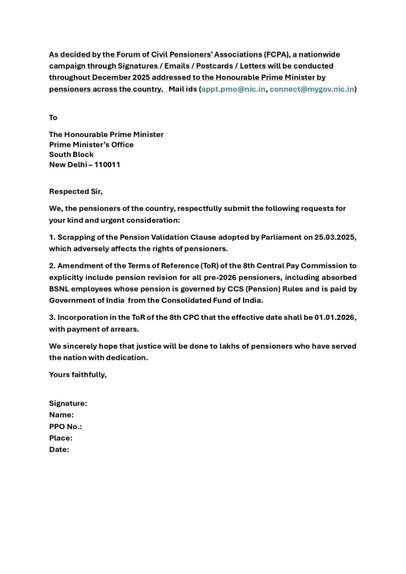 AIBSNLPWA has submitted a representation to the Hon’ble Prime Minister seeking amendment of the VIII CPC ToR and withdrawal of Part IV of the Finance Act 2025.