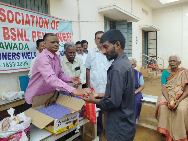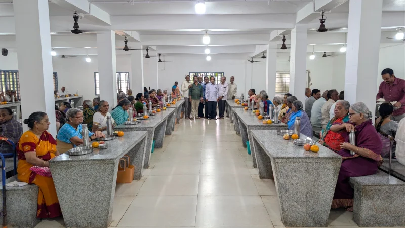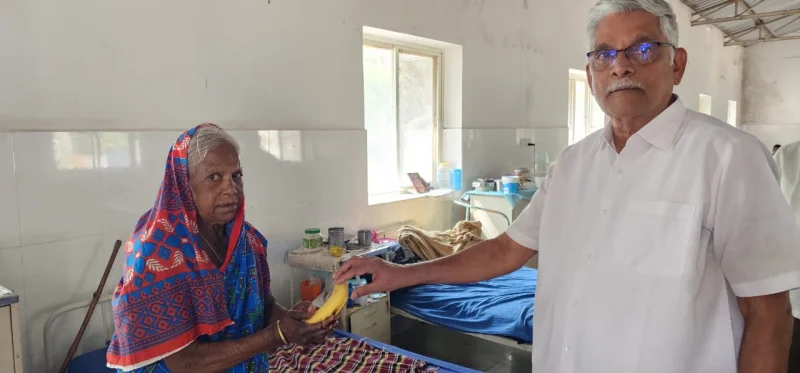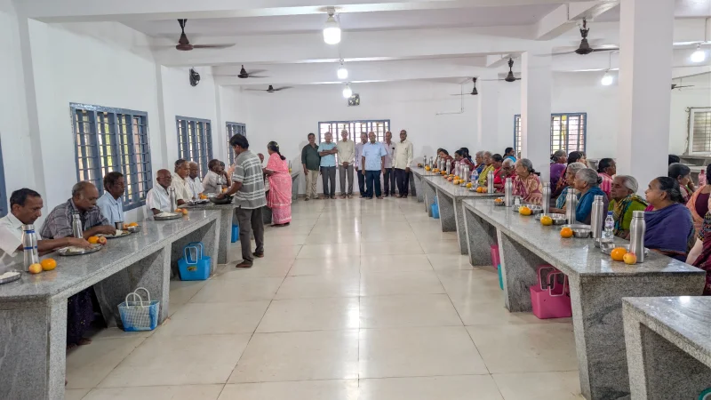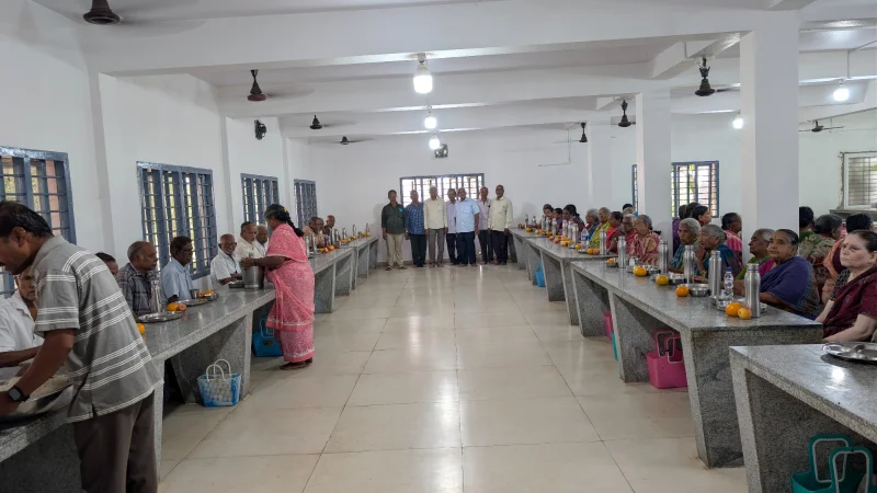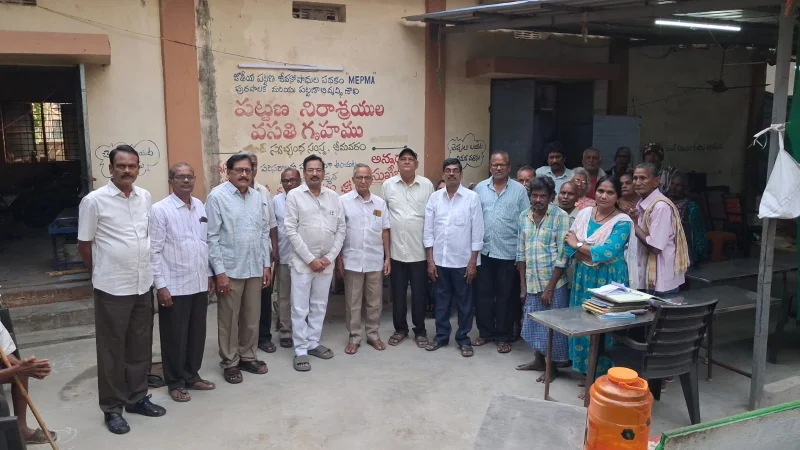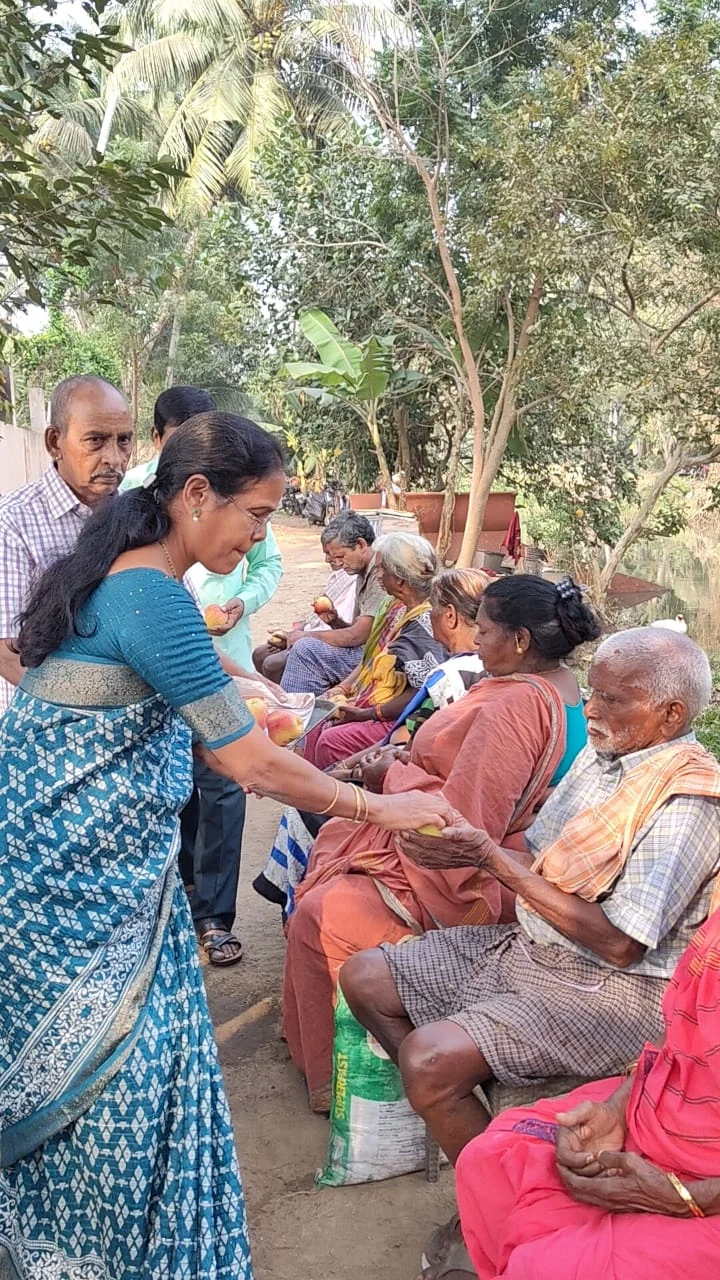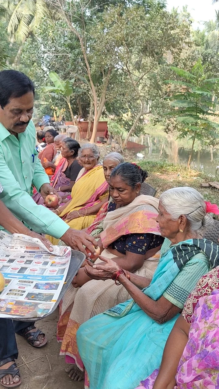 As part of the programme, fruits were distributed to elderly patients at the Palakollu Government Hospital. Subsequently, a free old-age home at Vedangipalem was visited, where food was served to the senior residents and time was spent with them in a warm and affectionate manner.